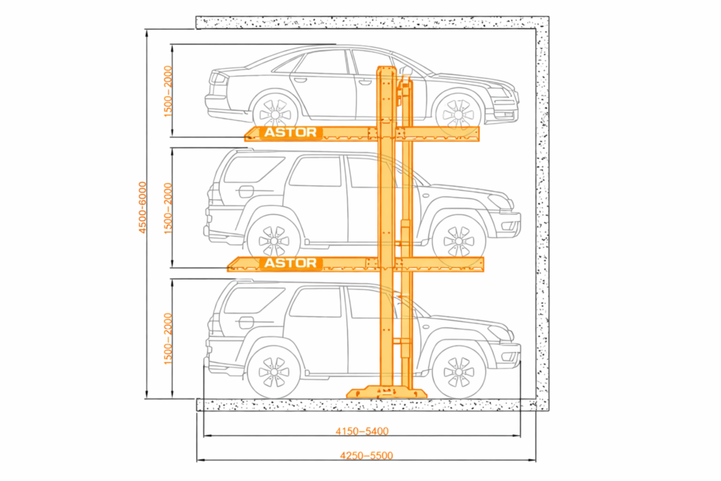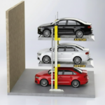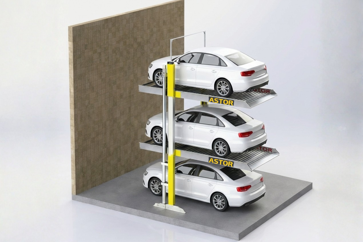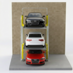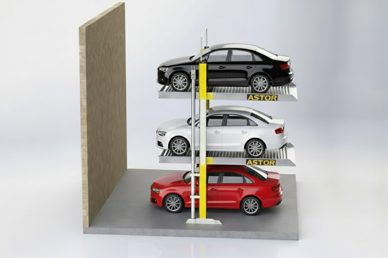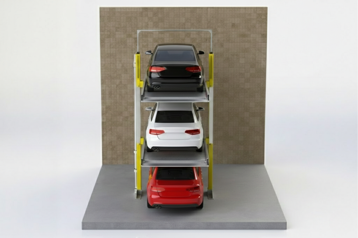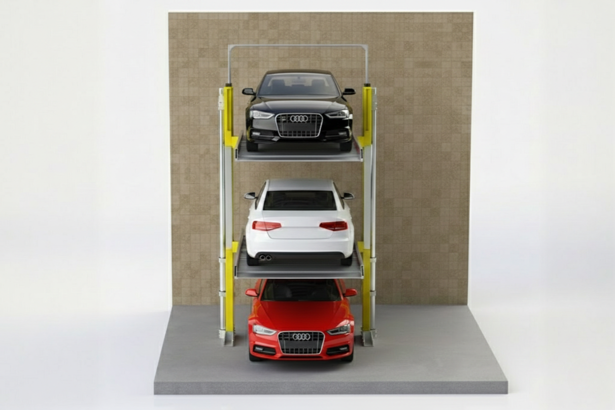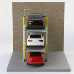 The A3DP Stack Parking System is a three-level vertical parking solution designed to increase parking capacity in limited spaces. The system operates using hydraulic cylinders and allows vertical movement of platforms only.